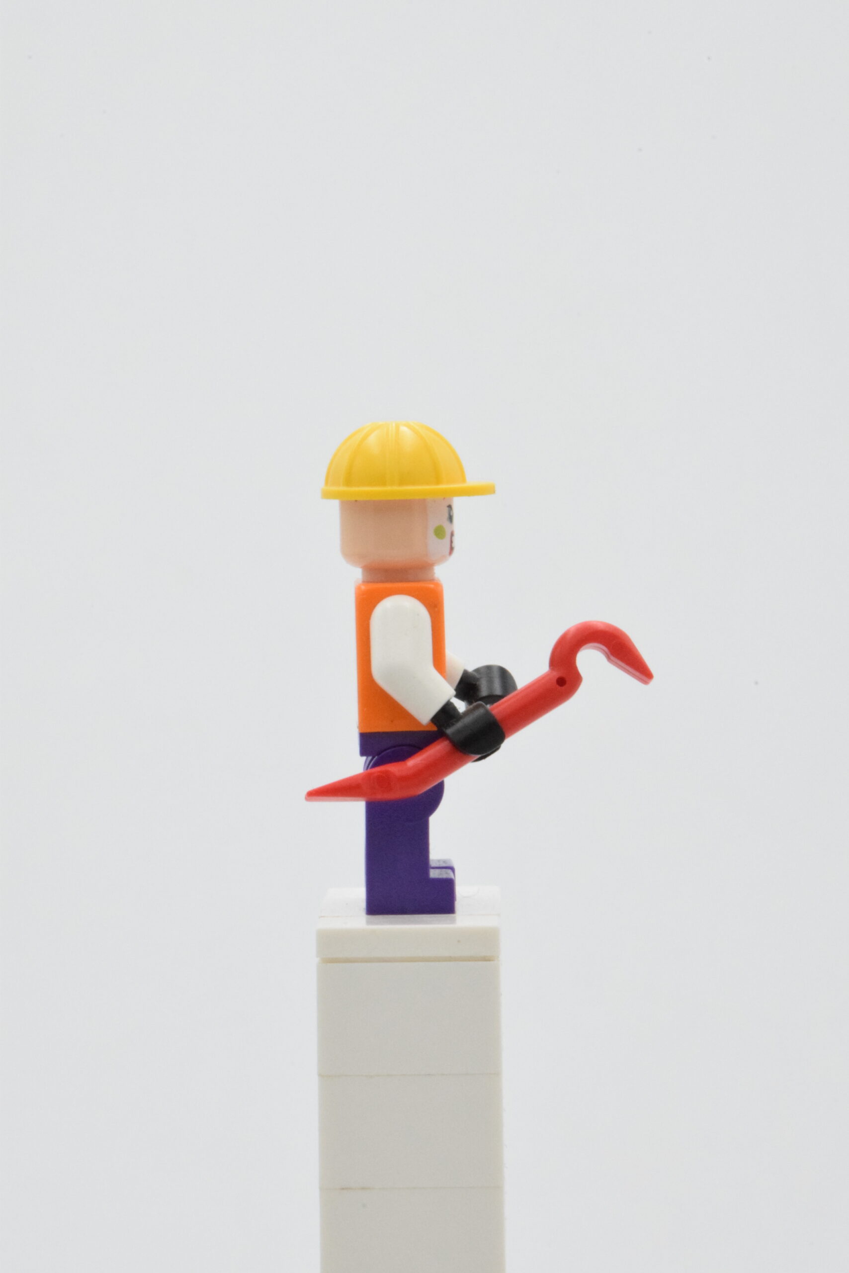 La minifigurine porte une veste de haute visibilité orange typique des ouvriers, ce qui la rend aisément reconnaissable dans le décor. Le casque jaune ajoute une touche de sécurité improvisée mais comique, contrastant fortement avec son visage au maquillage sombre, typique des sbires du Joker. Le pantalon violet complète le contraste de couleurs et souligne le caractère excentrique du personnage.