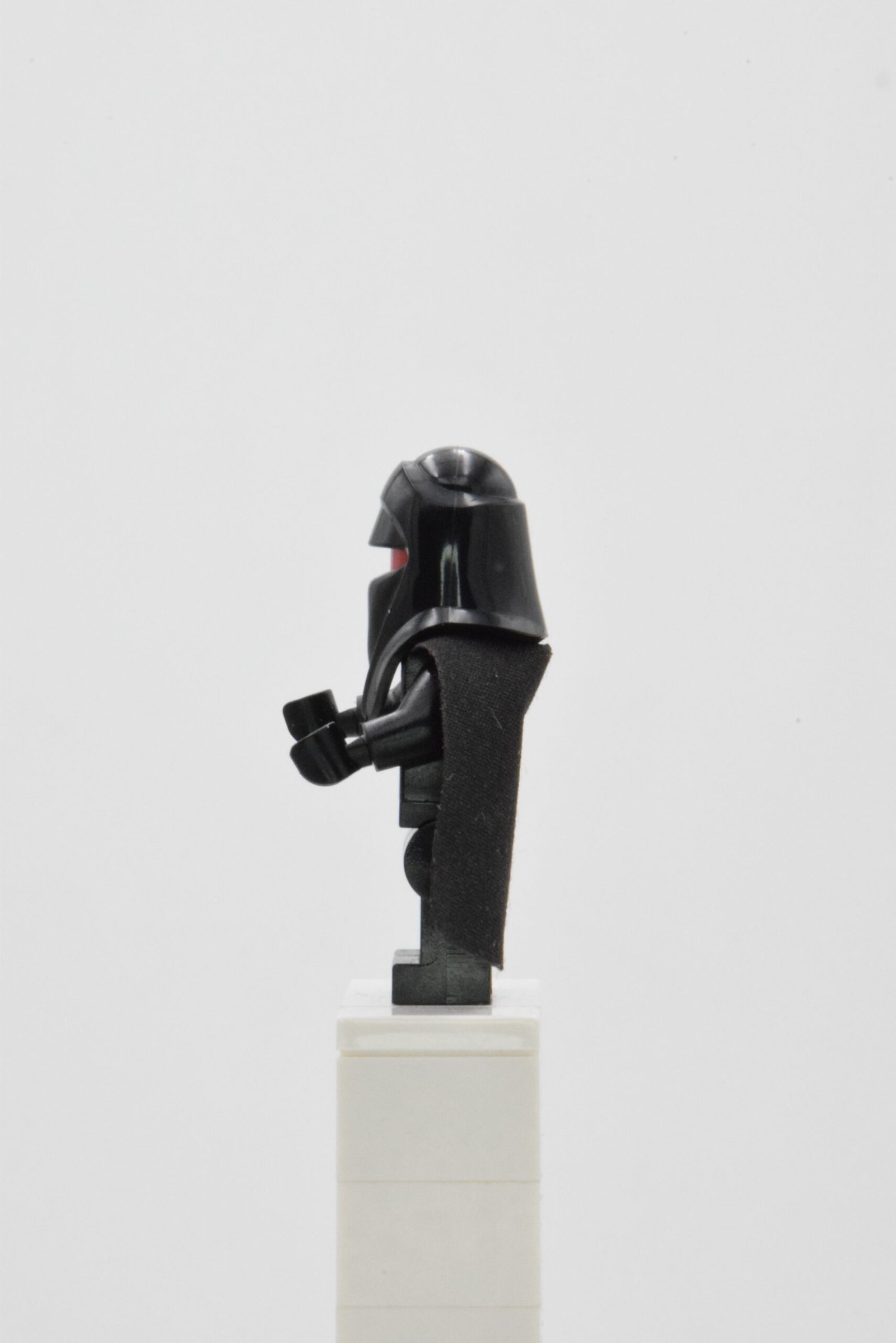 Le design est volontairement sobre et percutant : un casque noir lisse avec une visière rouge étroite, immédiatement reconnaissable, associé à une cape noire qui accentue l’élégance et la menace du personnage. Le torse et les jambes affichent des détails discrets mais efficaces, rappelant l’armure raffinée des forces impériales d’élite. L’ensemble offre un rendu visuel très fort, parfait pour les dioramas sombres, les bases impériales ou les scènes de confrontation.